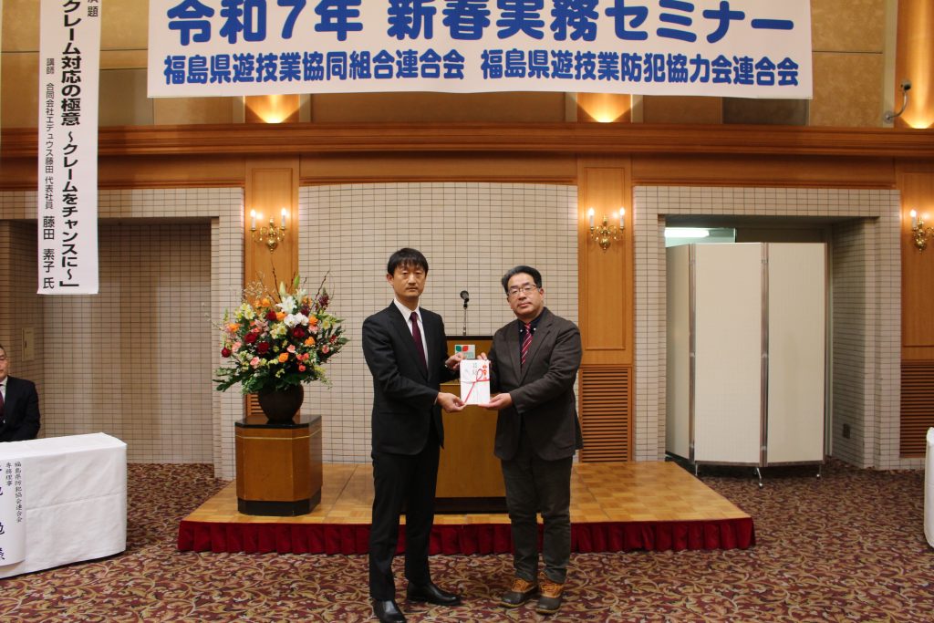 令和7年2月14日(金)福島市のホテル福島グリーンパレスにおいて、ふくしま子ども食堂ネットワークの代表江川和弥氏に対し、福島県遊連青年部劉副会長から活動助成金10万円の贈呈式を行いました。助成金の贈呈は、今回で4年連続4回目となります。