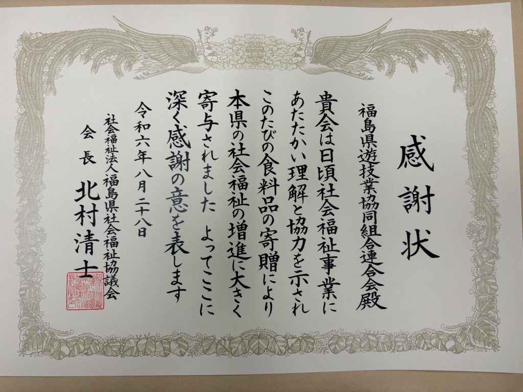 福島県社会福祉協議会 関 靖男事務局長(右)から感謝状をいただきました。