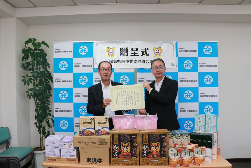 福島県社会福祉協議会の関 靖男 事務局長に食品と目録をお渡しし、協議会からは感謝状をいただきました。
