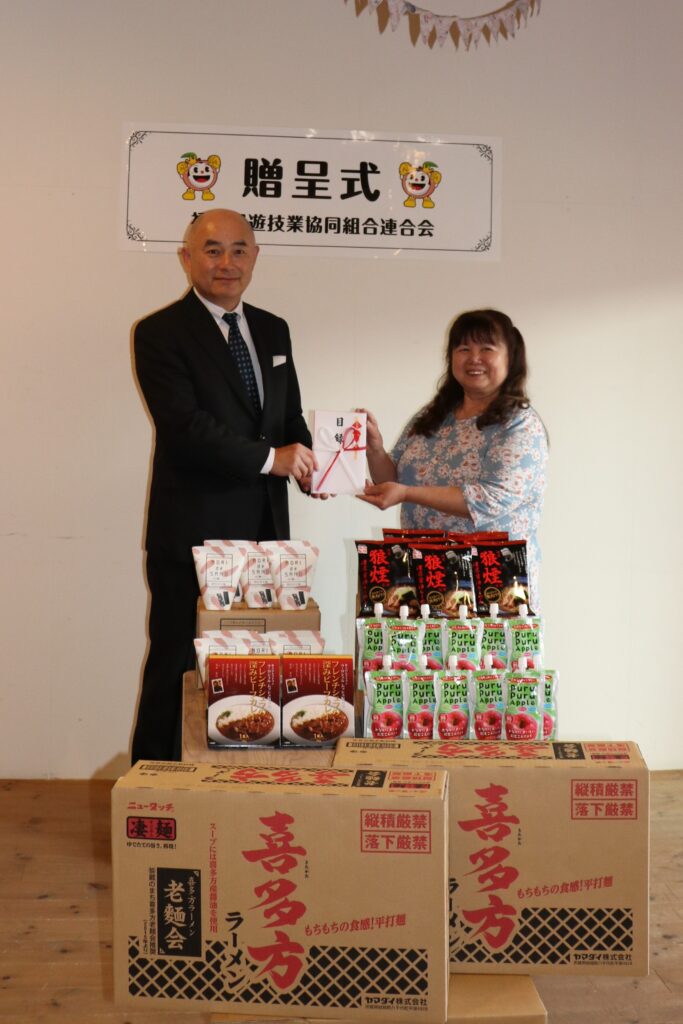 3月22日に郡山市にあるNPO法人コースター内において、諸田英模理事長から同ネットワーク共同代表の山本光子氏に対して、第10回福島県パチンコ・パチスロファン感謝デーにおける収益の一部としてレトルトカレーなどの食材約150点を贈呈しました。子供たちに美味しく食べて欲しいですね!